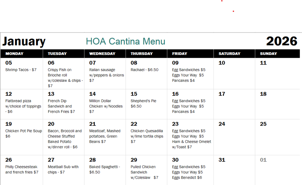 HOA Cantina Menu for the Month of January.
