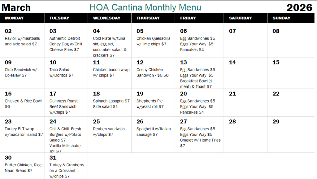 HOA Cantina Menu for the Month of February, 2026.